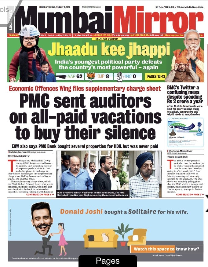 Mumbai Mirror felt Kejriwal’s “current’’ far away on the west coast, but paid more attention to a Punjab and Maharashtra Co-Operative (PMC) Bank story on the bank extending “favours to auditors, such as sending them on all-expenses-paid vacations to Goa and other places.”