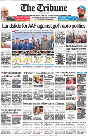 Thank you, The Tribune, for resisting the pun in the headline: ‘Landslide for AAP against goli maro politics’. The lead is a straight report that mostly focuses on the number of seats won. There’s a different take on Congress’ election failure as the paper notes that the grand-old party “looked happy with BJP’s loss”. Also read the reports on how BJP failed to sway Delhi’s Sikhs and the close battle in Patparganj which ended in a victory for Manish Sisodia. The paper doesn’t skip a mention of the verdict in the Muzaffarpur case and Trump’s India visit.