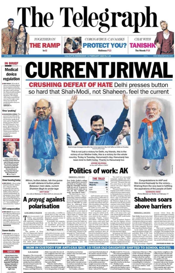 Does this headline work? Yes, if you can pronounce it. The newspaper calls AAP’s victory a “crushing defeat of hate”. The lead opens with, “Delhi’s ruling Aam Aadmi Party scored a hat-trick on Tuesday, sweeping the Assembly election with 62 out of 70 seats…’’ The paper also covers Amanatullah Khan’s victory in Okhla, the constituency where Shaheen Bagh falls.