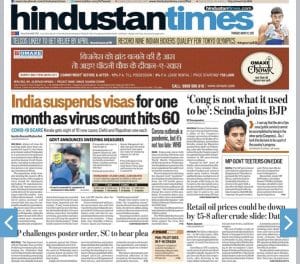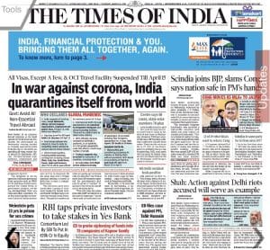 If you’re interested in the impact of the coronavirus, read the collateral damage such a ban would have in ‘Collateral: Almost 1 mn tourist a month; aviation, hotel slowdown’. The report states that apart from the hospitality industry “…in addition to airlines, a cascading impact is expected to be seen on allied sectors such as airports and hospitals.”Express’ page 1 report on Scindia’s defection to the BJP — ‘Day after, Scinida joins BJP and gets a Rajya Sabha ticket’ —terms this as a “reward’’ for leaving the Congress and reportedly taking 22 MLAs from Madhya Pradesh with him.