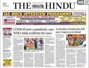 Expectedly, coronavirus is the lead in The Hindu (“COVID-19 now a pandemic, says WHO; India confirms 60 cases”) and the lead highlights a lesser known fact: “According to the WHO, a pandemic is declared when a new disease for which people do not have immunity spreads around the world beyond expectations.”