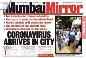 Just when everyone wondered how the financial capital had escaped the coronavirus, Mumbai Mirror announces its arrival in the city as “The Brihanmumbai Municipal Corporation (BMC) confirmed two positive cases of COVID-19 in the city – a couple from Andheri (West), aged 69 and 70, who travelled to Dubai this month.”