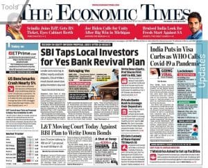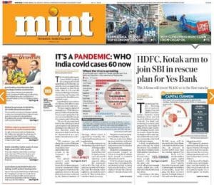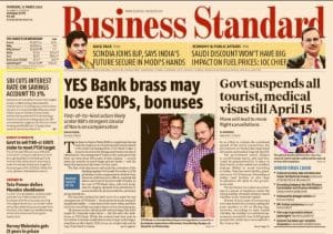 The Economic Times leads with the State Bank of India’s attempts to rope in local investors for the “Yes Bank Revival Plan”. The list of potential investors include “ICICI, HDFC, Kotak and Axis along with a few private investors”. ” SBI is simultaneously examining a deal with bondholders for conversion of Yes Bank’s additional Tier 1 (AT 1) securities into shares of the private bank,” the report says.