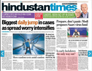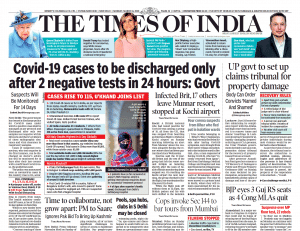 The Times of India’s lead story (‘Covid-19 cases to be discharged…’) quotes the government on people who have recovered from the virus: COVID-19 cases will only be discharged after two negative tests in 24 hours. According to the daily, the total number of cases in India rose to 115, with Maharashtra leading with 34 cases — TOI notes that even Uttarakhand has joined the list of places with reported cases.
