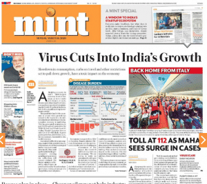 Surprisingly, Mint is the only pink paper to note how the virus will “cut into India’s growth” as it highlights the “slowdown in consumption, curbs on travel and other restrictions set to pull down growth, (that will) have a toxic impact on the economy”.
