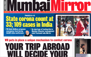 Mumbai Mirror reported the total number of cases in India to be at 109. While its main story was a move the Western Railway undertook, which would determine who could travel by train. Mumbai Mirror reported, “the WR will screen passengers with a travel history to China, France, Germany, Iran, Italy, South Korea and Spain in the past one month, and cancel their train ticket on the spot if they show symptoms of COVID-19.”