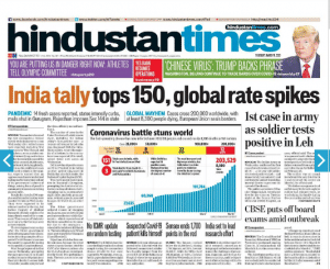 The HT lead story is about India’s coronavirus tally crossing 150 cases, with 14 new cases reported. “States intensify curbs, malls shut in Gurugram, Rajasthan imposes Sec 144 in state. Global Mayhem: Cases cross 200,000 worldwide, with at least 8,300 people dying, European Union seals borders”.