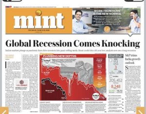 Mint’s lead (‘Global Recession Comes Knocking’) details how “Indian stocks plunged again on Wednesday, as investors fled risky assets amid fears that coronavirus infections may surge in the country, wreaking economic havoc.”