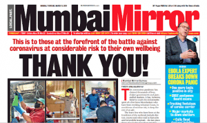 In Mumbai Mirror, the headline: “THANK YOU!’’ says it all: “This is to those at the forefront of the battle against coronavirus at considerable risk to their own wellbeing”.