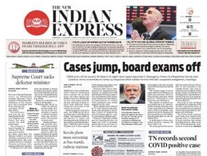 The New Indian Express leads with the cancellation of board exams due to a rise in COVID-19 cases (‘Cases jump, board exams off’) adding “Given the gravity of the situation, CBSE put off all remaining class X and class XII exams.”