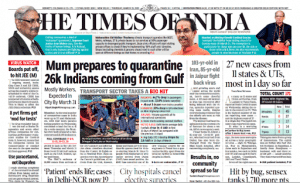 The lead story is somewhat alarming: Mumbai is set to welcome 26,000 Indians coming from the Gulf (‘Mum prepares to quarantine…’). “As the total number of coronavirus cases in India went up to 171 and Maharashtra, with four more patients testing positive on Wednesday, continued to lead the list at 45 (by a wide margin), the Mumbai civic body prepared to welcome around 26,000 Indians expected to land in the city between Thursday and March 31 from Covid-19-hit Gulf nations such as the UAE, Kuwait, Qatar and Oman”, reports TOI.