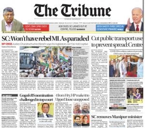 The Tribune takes a break from the pandemic and leads with the political tangle in Madhya Pradesh (`SC: Won’t have rebel MLAs paraded). The report reads, “Noting that the rebel MLAs may or may not go to the Assembly, the Bench said it had to ensure that the MLAs could freely exercise their choice.”