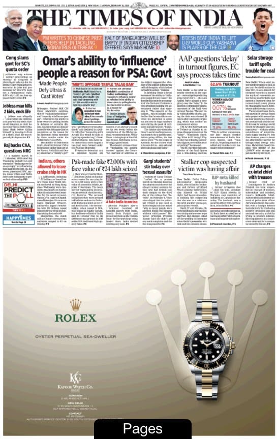 The Times of India has no flap today but is cramped for news space on account of a half-page Rolex ad. The lead on former J&K chief minister Omar Abdullah highlights the reasons why this was done — a “combination of ‘radical methodology’ and ‘capacity to influence people’, reflected in his ability to draw voters to polling booths in defiance of terrorist diktats.” This was the recommendation by an advisory board.