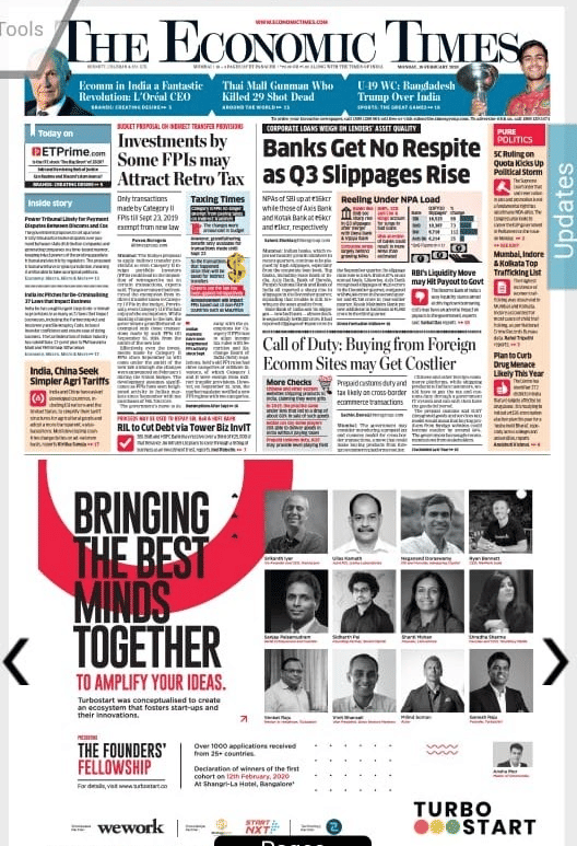 On the Economic Times’ flap is the report about the likelihood of restrictions being imposed on exports of crucial antibiotics and vitamins from China in the wake of the lockdown due to the coronavirus outbreak. Page 1 carries a half-page advertisement, so there are fewer reports. It’s lead is on the Budget proposal to apply indirect transfer provisions to Category II foreign portfolio investors (FPIs) as the paper notes that it “could lead to the imposition of retrospective tax on certain transactions”.