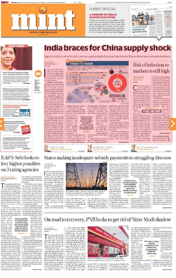 Mint has grim news for the markets — “Imports to India set to be disrupted as rapid spread of coronavirus forces Chinese factories to extend shutdown”. The imports that are likely to take a hit as a result of the lockdown include electronic items, machinery, organic chemicals and plastic items.