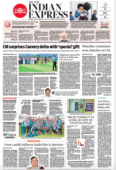 The New Indian Express leads with Tamil Nadu Chief Minister Edappadi Palanaswami’s announcement that the Cauvery delta region would be declared as a Protected Special Agricultural Zone (PSAZ), a “long-pending demand of farmers’ associations and political parties”. There’s an exclusive on the massive outreach programme started by the National Commission of Minorities (NCM) to “convince Christians in India that CAA is a good move”. The story says the panel travelled to seven states and talked to several church leaders, “many of whom have already issued statements against the CAA”.