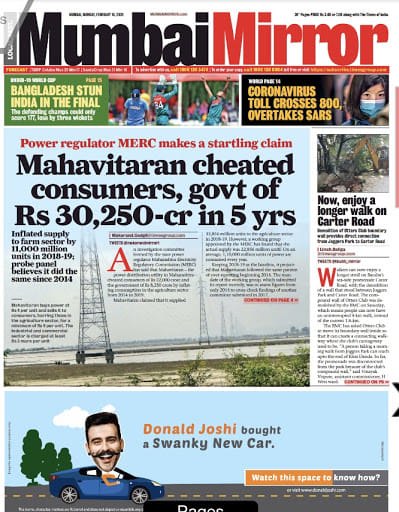 Mumbai Mirror’s lead report is on Mahavitaran, a power distribution utility in Maharashtra, which duped the people and the government “by inflating consumption in the agriculture sector from 2014 to 2019.” Also, some good news for Mumbai strollers as “walkers can now enjoy a longer stroll on Bandra’s sea-side promenade Carter Road, with the demolition of a wall that stood between Joggers Park and Carter Road.”