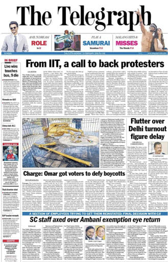 The Hindu also leads with J&K but the report is not on Abdullah and Mufti. It’s an ironic lead story on “uninterrupted” Internet in the Valley for potential investors. The administration is “offering an incentive to IT companies to operate in three-shifts and to facilitate women working during the night by providing transportation and security.” While Hindu reports on Delhi’s voter turnout, it omits to mention AAP’s suspicions — odd.