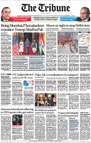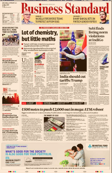 Business Standard’s lead is unimpressed with the outcome of Trump’s visit — ‘Lot of chemistry but little maths’, it says. The paper “did not see any deadlock broken on the bilateral trade deal“.