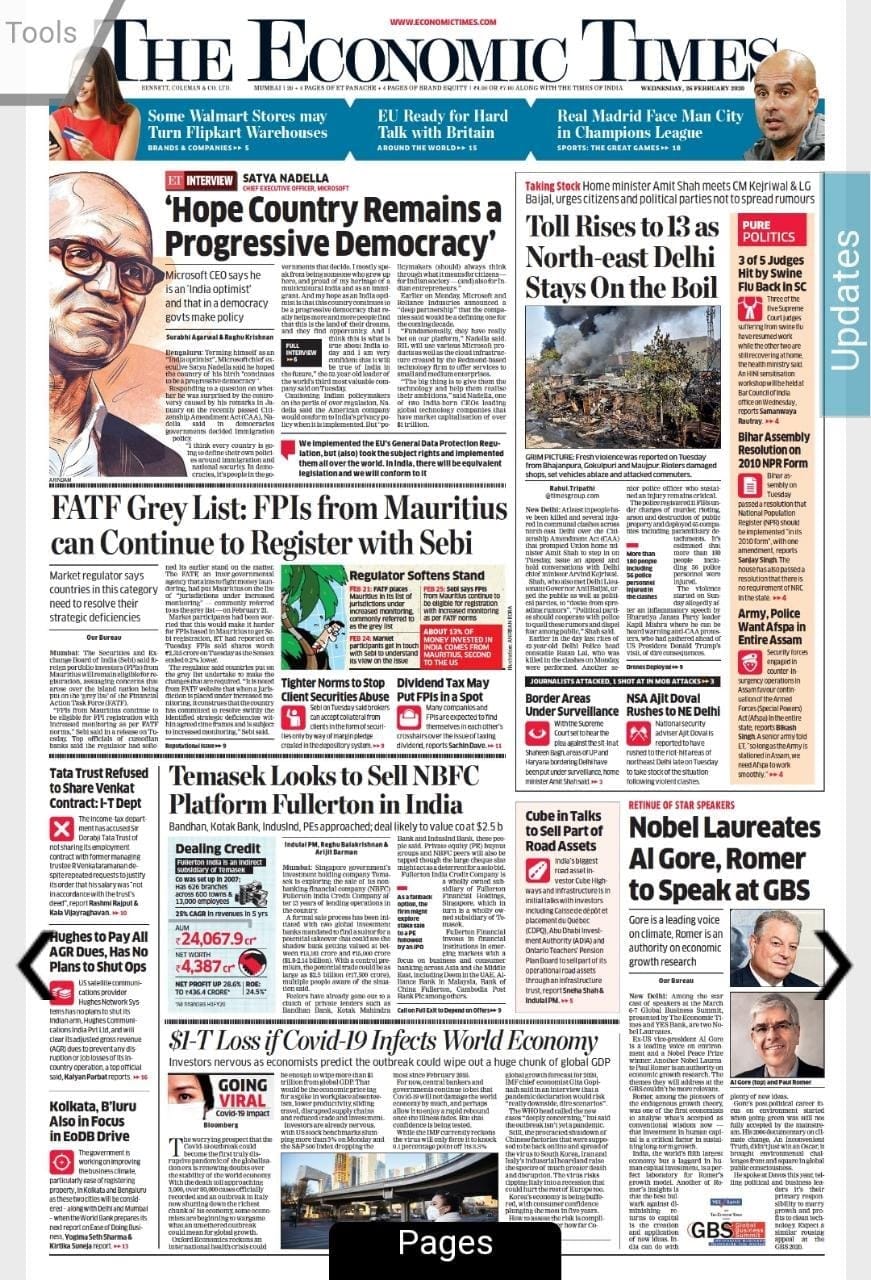 ‘Hope county remains a progressive democracy’ is the exclusive lead for Economic Times regarding Microsoft CEO Satya Nadella’s visit to India. The report highlights Nadella’s almost evasive response about the controversy over his earlier critical remarks on the Citizenship Amendment Act. “I think every country is going to define their own policies around immigration and national security,” the report quotes him as saying.