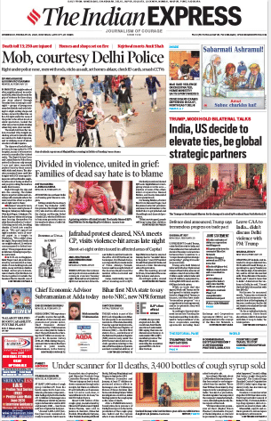 As parts of Delhi were on fire for the third consecutive day and the death toll rose to 18, The Times of India and Hindustan Times chose to lead with banner headlines on the Modi-Trump love fest, confining the violence in Delhi to their flap pages. The Indian Express and The Telegraph, on the other hand, boldly reported on the violence targeting Muslims.