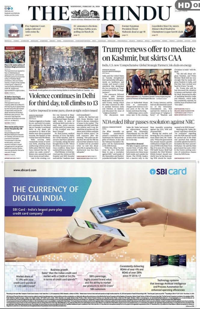 More interesting is its choosing to focus on POTUS’ statements about mediating in Kashmir issue, yet again, in its second lead, ‘Trump renews offer to mediate on Kashmir..’ It adds that “India and the United States on Tuesday strengthened their partnership with agreements on healthcare and energy…’’