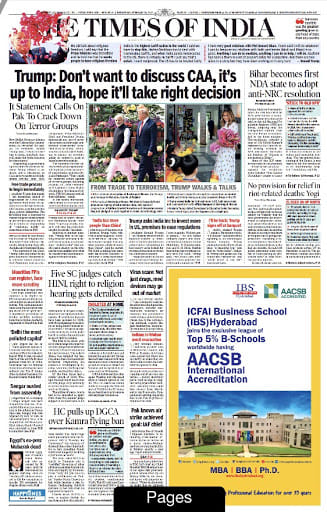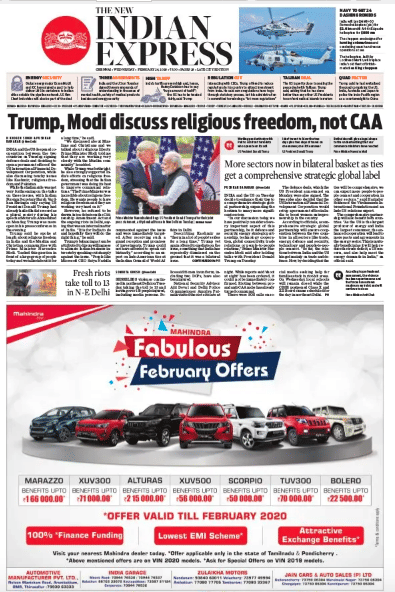 “…Trump refused to get drawn into a discussion on CAA as he wrapped up a high octane…visit”, notes TOI. The rest of the report highlights the joint India-US statement which “unequivocally reflected India’s concerns…” on Pakistan’s role in terrorist attacks.