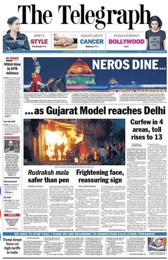 In ‘… as Gujarat model reaches Delhi’, The Telegraph compares Delhi to Gujarat in 2002 when the state saw communal violence in which thousands of people died. “Many residents alleged that the police did not act when they were attacked. Late at night, reports came in that shanties in Mustafabad had been set ablaze and ambulances were blocked.”