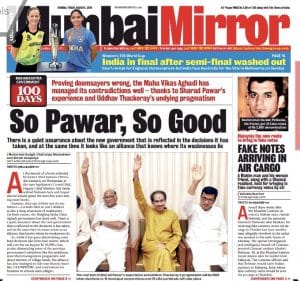 Mumbai Mirror reports on the Maharashtra coalition government, ‘So Pawar, So Good’. The paper notes, “Proving doomsayers wrong, the Maha Vikas Aghadi has managed its contradictions well – thanks to Sharad Pawar’s experience and Uddhav Thackeray’s undying pragmatism.” It also adds that the “fledgling Maha Vikas Aghadi government has done well” referring to some of its “bold decisions” like the farm loan waiver.