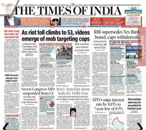 The lead story in The Times of India (‘As riot toll climbs to 53, videos emerge of mob targeting cops’) notes how “a mob of over 2,000 anti-CAA protesters attacking badly outnumbered policemen, throwing stones at them and even firing.”
