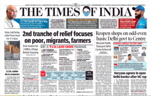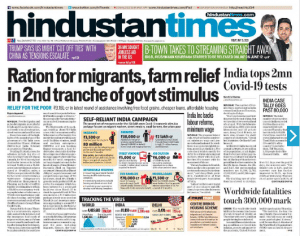 The Times Of India’s lead ‘2nd tranche of relief…’ reports that the measures “…included affordable rental housing facility for migrant workers, free foodgrains for those without ration cards and loan schemes for farmers and street vendors”.