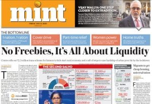 Mint covers the Rs. 2.3 trillion “cheap loans programme for farmers” and other measures to uplift the urban poor unveiled by Sitharaman Thursday. In ‘No Freebies, It’s All About Liquidity’, it includes a prediction by Dhiraj Relli, managing director and chief executive of HDFC Securities: “…this may not result in direct and immediate boost to demand and, hence, economic revival can take some time.”