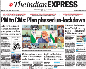 For the second successive day, The Indian Express goes with an overarching headline, eight columns today. Express’ lead is Modi’s interaction with chief ministers to plan a phased un-lockdown. The paper says he called for a common strategy, underscored that the global numbers regarding the virus were still grim and there could be a possible second wave.