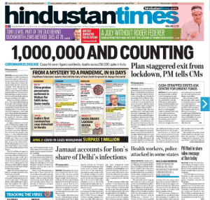 Hindustan Times’ lead story is in all caps, perhaps to put the message across forcefully: ‘1,000,000 AND COUNTING’, as the paper dramatically describes how Covid-19 went from a mystery to a pandemic in 93 days.