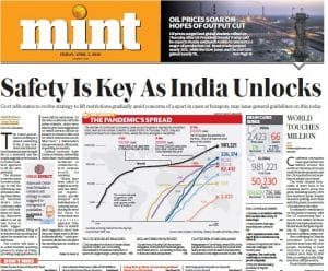 Note how the newspaper always favors big, bold headlines. Mint’s lead today is “Safety is Key As India Unlocks” also covers the Union government’s plans to gradually lift the lockdown. It includes a comment from Maharashtra CM Uddhav Thackeray: “The Prime Minister said that state governments should not lift the lockdown immediately from 15 April but it should happen in phases.”