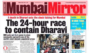 Another alarming headline in Mumbai Mirror says, “A death in Dharavi sets the clock ticking for Mumbai, The 24-hour race to contain Dharavi”. The Mumbai daily reports, “On Wednesday, the death of a 56-year-old man from Covid-19, pushed an already-stretched administration into red alert. The man, a garment seller, who had tested positive earlier in the day was a resident of Dharavi. The slum spread over 2.2 kilometres has a population of about eight lakh and is one of the most densely-populated areas in the world. A community spread in Dharavi, they knew, would be lethal to Mumbai’s fight against coronavirus.”