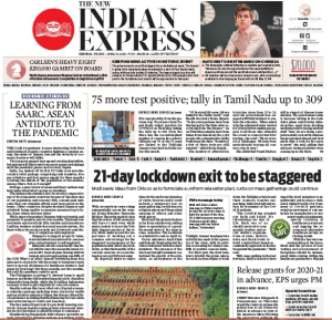 The other important story of the day is the post-lockdown plan proposed by the PM. In `Common staggered exit plan…’’, the paper says, “Indicating that there is need for a coordinated approach to lifting of restrictions after the national lockdown ends on April 14 to ensure that the gains of social distancing and isolation… are not lost, Prime Minister Narendra Modi on Thursday asked chief ministers to consider a common exit strategy once the lockdown ends.”