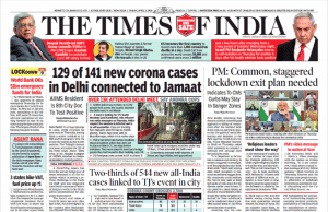 The lead story in The Times of India ‘129 of 141 new corona cases in Delhi connected to Jamaat’, clearly puts the blame on the Tablighi Jamaat for the upsurge in coronavirus cases. The daily reports, “In a huge upsurge in cases, Delhi recorded 141 new ones on Thursday, among them a senior resident at AIIMS and his pregnant wife. He is now the eighth doctor to test positive. The Tablighi Jamaat evacuees accounted for 129 of the fresh cases.”
