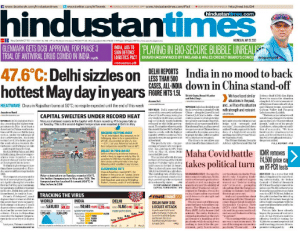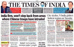 The lead story on The Times of India highlights the China-India standoff in Ladakh with an assertive headline — ‘India firm won’t step back from areas where Chinese troops have intruded’. TOI writes that India will continue to “defend its interests resolutely” and deploy “appropriate resources” to the border.