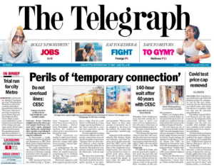 In a six-column lead, The Telegraph focuses on the power outage in Kolkata after the havoc caused by the Cyclone Amphan. In ‘Perils of ‘temporary connection’’, the paper notes that the Calcutta Electric Supply Corporation (CESC) will set up temporary connections to help restore electricity. However, the report notes this kind of connection is only meant for basic power usage for fans or lights, but switching on an AC could overload it.