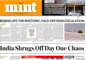 In its lead, ‘India Shrugs Off Day One Chaos’, the paper brings the conversation back to domestic air-travel which has picked up efficiency after a bumpy start. It reports: “…future demand for air travel and the fortunes of domestic airlines, said analysts, will hinge on the course of the country’s economy, hobbled last year by a downturn and now by a coronavirus-induced grinding down.” Next to the report is a strategically placed infographic on the number of Covid-cases in India surging past the 1,50,000 mark.