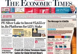 The Economic Times leads with news on US private equity firm Silver Lake investing “Rs. 5,655.75 crore ($747 million) in Jio Platforms for a 1.15% stake”. This, after Jio’s major tie-up with Facebook two weeks ago. According to the daily, this won’t be the last stake sale. Analysts indicate “an initial share sale for the digital unit of Reliance Industries (RIL) in about two years”, it adds.