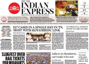 The New Indian Express leads with the grim news of 527 new coronavirus cases and one death in Tamil Nadu.“Koyambedu market (in Chennai) continues to be the major source for spurt in cases” and “several traders told NIE that social distancing was never implemented…[making] it a disaster in the making from day 1”, it reports.