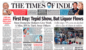 The Times Of India’s lead story is on the easing of restrictions in Delhi: ‘First Day: Tepid Show, But Liquor Flows’ has two stories: The first says ‘Most domestic helpers give work a miss…’, noting that in most areas RWAs gave domestic workers a miss and did not allow them to come.