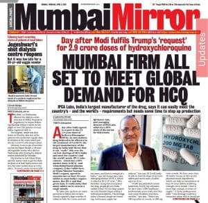 In the lead story, ‘Mumbai firm all set to meet global demand…’ Mirror says that according to IPCA’s joint managing director, the firm “can ‘easily’ tide over the current shortage of HCQ [in] India and meet the country’s and the world’s needs”. An interesting point is Jain’s remark on shortages. He blamed the lack of supplies on people buying large quantities of HCQ. “The shortage today is because people are hoarding, not because supply has reduced,” the report quotes him as saying.