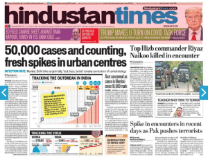 Hindustan Times’ lead story follows from the bad news in TOI — “50,000 cases and counting, fresh spikes in urban centres” and worries that the “limited reopening of businesses made necessary by a sluggish economy…’’ may trigger another wave of cases in hotspots.