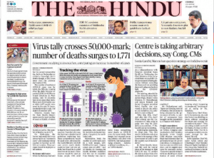 In ‘Centre is taking arbitrary decisions, say Cong. CMs’, the paper reports that during a videoconference with Congress president Sonia Gandhi Wednesday, the CMs of the party-ruled states had accused the central government of “taking decisions without consulting the states and not providing them with adequate funds to fight the Covid-19 pandemic”.