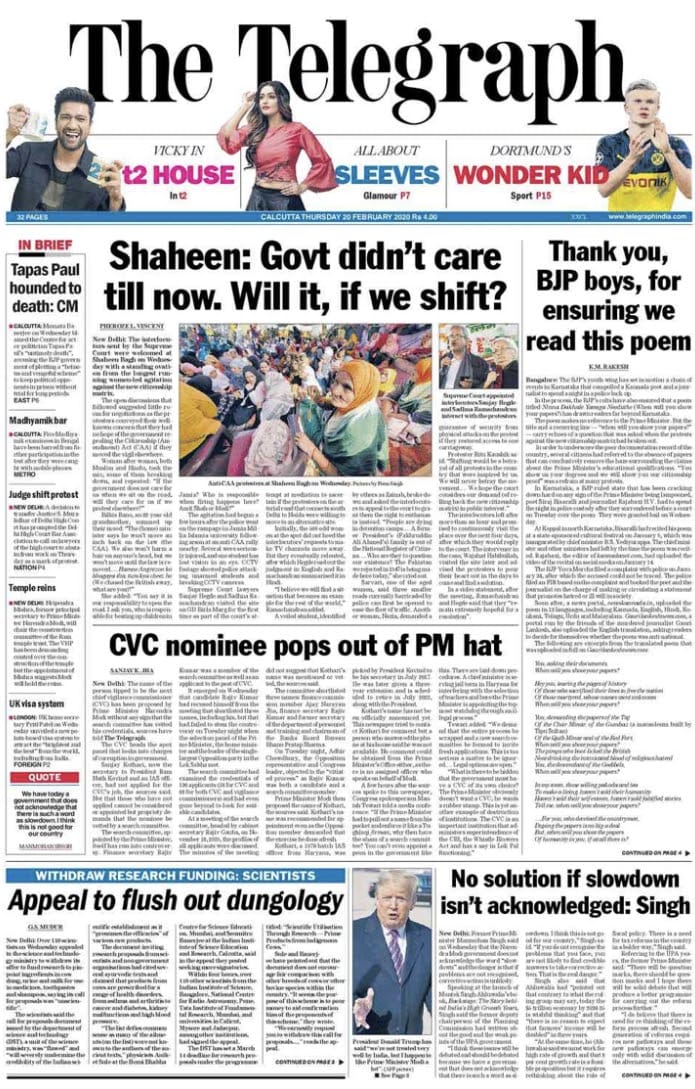 Odd second lead on a poem, the report notes, the “poem (which) makes no reference to the Prime Minister. But the title and a recurring line — ‘when will you show your papers?’— carry echoes of a question that was asked when the protests against the new citizenship matrix had broken out.”