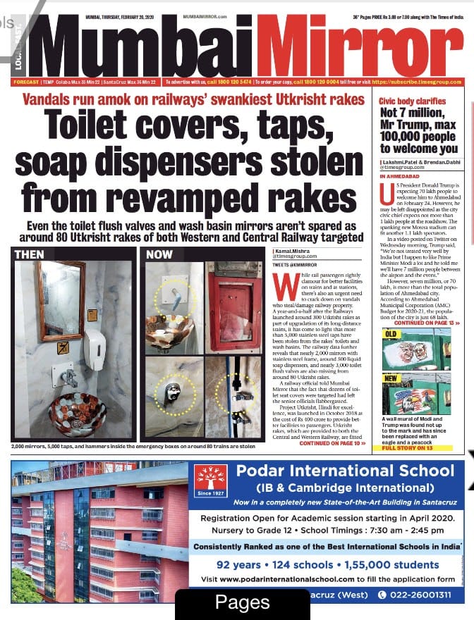 Mumbai Mirror reports on a strange case of robbery of sanitary fixtures on trains — “While rail passengers rightly clamour for better facilities on trains and at stations, there’s also an urgent need to crack down on vandals who steal/damage railway property.”