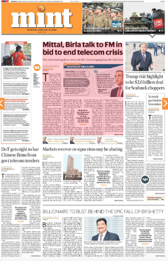 On the telecom crisis, the paper highlights the repeated efforts by Vodafone Idea Chairman Kumar Mangalam Birla to “seek relief” including the Tuesday meeting with top officials of the Department of Telecommunications.